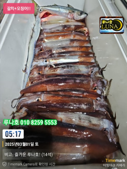 7월 13일 한치 초중반은 그럭저럭 재미있게 놀았는데.후반전 폭망 ;;전날 조황 반에 반 토막 나고왔습니다.ㅜ.ㅜ50 ~8수까지 평균 20~30수 사이즈도 잔게 더나왔네요.비맞으며 수고들 많으셨습니다.출조문의 010 8259 5553 === 통영 루나호 예약안내 ===예약문의 : 010-8259-5553선장(선주) : 010-4876-5557오시는길 : 통영시 산양읍 남평리 1277-5 또는 항진피싱 맞은편홈페이지 : http://luna.sunsang24.com//